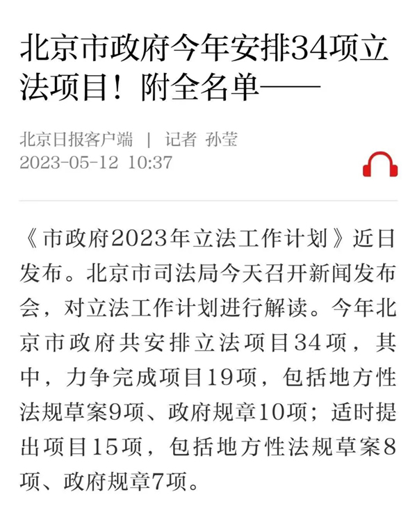 5月12日,北京青年报客户端发表《北京市政府2023年立法工作计划34项》一文,对立法计划的解读内容进行报道。