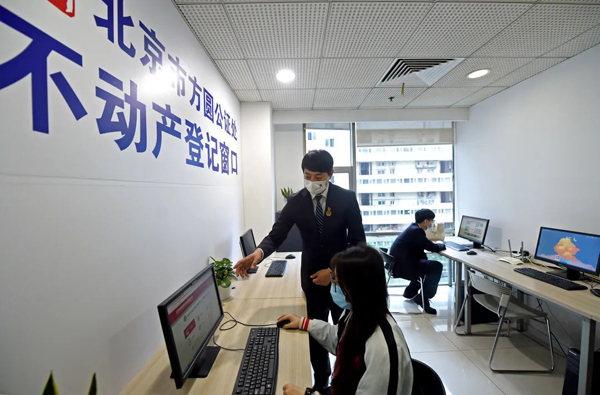 11月2日,北京市方圆公证处工作人员指导当事人通过“公证+不动产登记”一站式法律服务窗口申请办理相关业务。