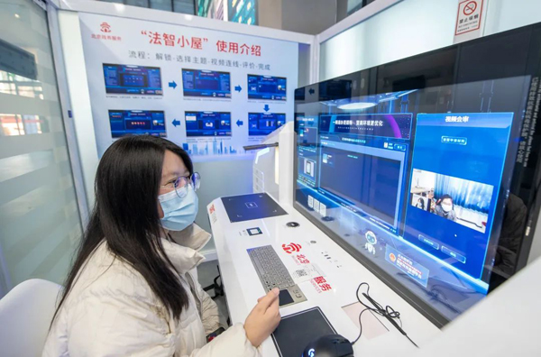11月15日,市民在“法智小屋”与律师进行视频咨询。在“法智小屋”可以享受法律咨询、法治体检、公证业务等多种服务。