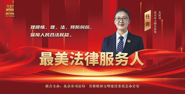 任青,公证执业30多年以来,她以急老年人之所急、想老年人之所想、解老年人之所难的执业责任感,坚持情理法相融合,以女性特有的感染力、用“真理”赋予的说服力、法律具有的强制力,让当事人“口服心更服”,成为老年人群体的“知心人”;她长期热心公益普法工作,积极探索公益基金、社会组织、公证机构多方合作发展渠道,把满足老年人公证服务需求作为重要课题,成为躬身公证公益服务的“热心人”。多次获评北京市方圆公证处“公益之星”,2019年获北京市司法行政系统“新时代司法为民好榜样”称号。