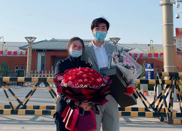 3月28日清晨,伴随着同事们祝福的视频,撖毓聪收到了监狱准备的一大束红玫瑰,教导员胡焕美代表监区送上祝福爱情甜蜜的巧克力,监区长魏贺春给她下达了“撤出监区,回家领证”的命令!
