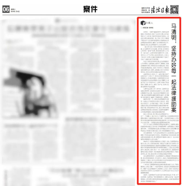 在马清明的带领下,区法律援助中心积极提升便民服务举措,简化受理审批程序,并为老年人、残疾人等困难群体提供法律援助上门服务,其中先后两次跨区往返百余里地为年过九旬且行动不便的受援人办理共有物纠纷案件。
