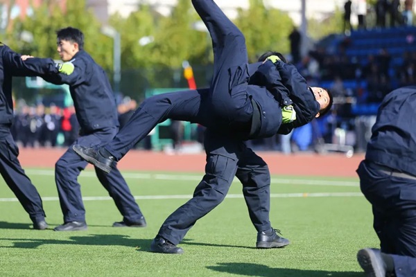 1人手持防爆盾、警用甩棍,1人戴防暴头盔、防刺背心、防割手套、约束叉,1人着配有手铐、警笛、防割手套等装备,后3人跑至50米终点以佩戴装备规范且最快的一组获胜。
