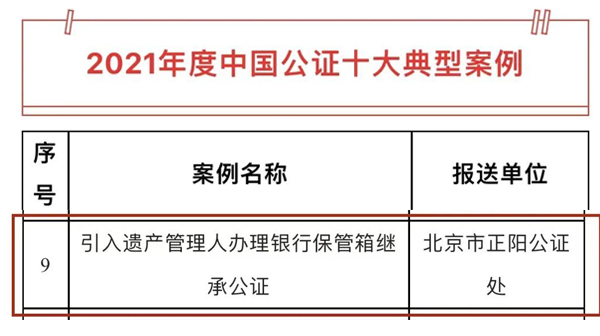 近日,由司法部公证理论研究与人才培训(湘潭大学)基地举办的“2021年度中国公证十大典型案例”评选结果揭晓,北京市正阳公证处报送的“引入遗产管理人办理银行保管箱继承公证”案例在榜。