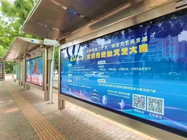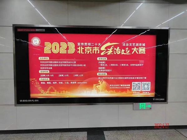 利用北京地铁站台、公交候车亭、三环路广告灯箱等媒介,刊登大赛宣传内容,法治文艺大赛社会面宣传全面铺开。