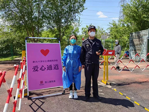 在西三旗街道司法所,司法助理员王鹤与海淀公安分局的丈夫并肩投入到疫情防控工作中,连续数日坚守在核酸检测点,开展秩序维护工作。现场相遇,夫妻俩也只是简单叮嘱两句“注意安全”,便又各自忙碌起来。