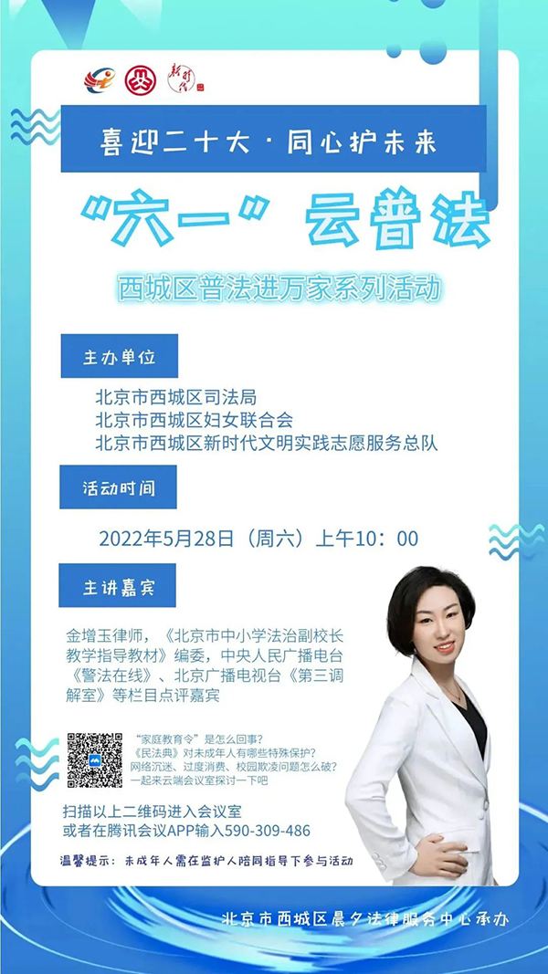 在《民法典》颁布两周年之际,西城区司法局通过线上直播的方式,开展普法进万家系列活动,5月28日,“六一”专场即将开启,《民法典》对未成年人有哪些特殊保护?“家庭教育令”指的是什么?市民可扫码参与直播活动,了解相关法律知识。