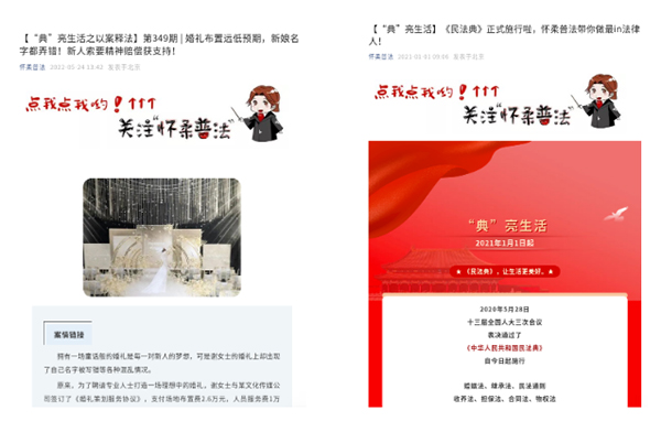 自2021年起,怀柔区司法局利用微信公众号,推出【“典”亮生活】《民法典》特别栏目,以案释法开展《民法典》线上宣传,截至目前已推送350期。在《怀柔报》开设《民法典》法律知识问答系列活动。通过各普法责任制单位与怀柔区新媒体联盟形成合力,大力宣传《民法典》亮点活动,打造抬眼可见的《民法典》法治宣传氛围。