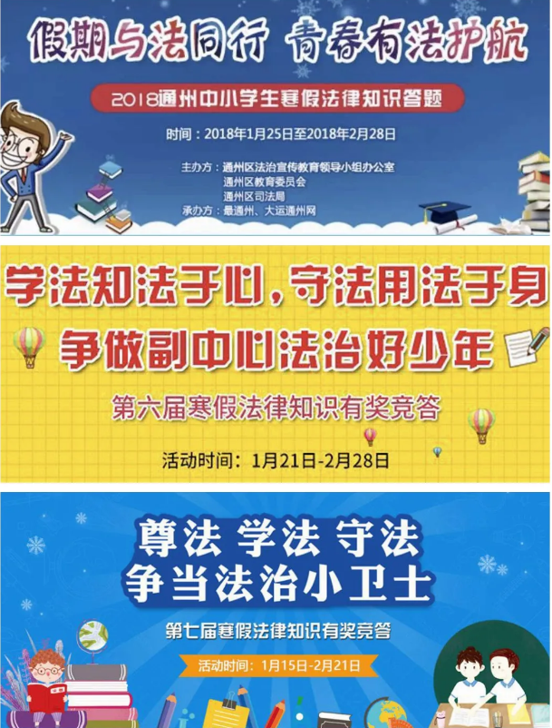 自2016年以来,通州区司法局连续五年,利用孩子们的寒假时间开展网络法律知识竞答活动。通过在线答题的形式,考察学生法律知识。活动参与率逐年攀升,2020年达到91.53%,累计受众超过31万人次,已成为通州区青少年法治宣传教育的品牌活动。