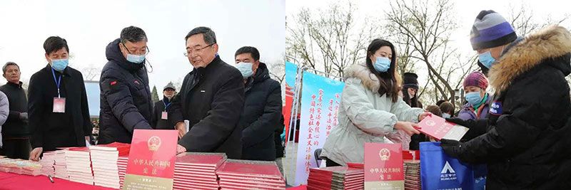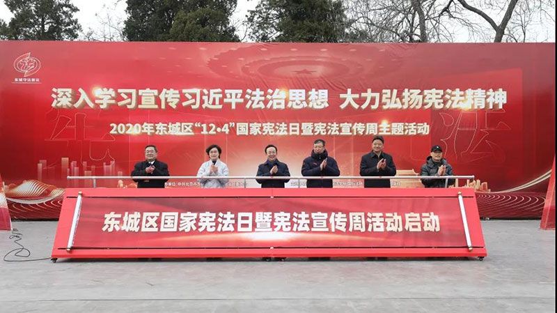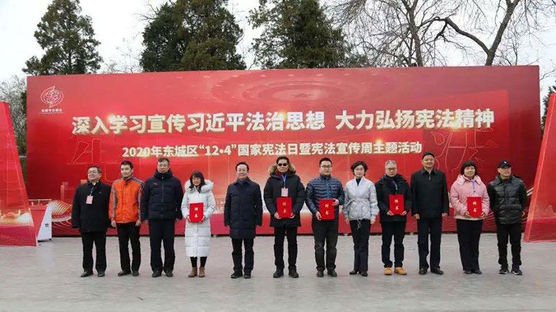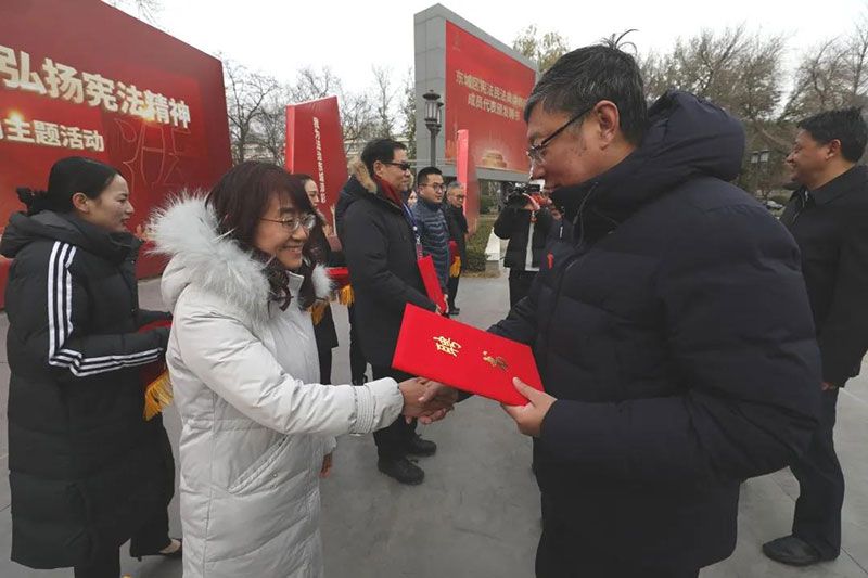 与会领导先后为东城区民法典讲师团成员代表颁发聘书、为街道居民代表赠送宪法、民法典书籍,共同启动2020年东城区“12.4”国家宪法日暨宪法宣传周主题活动,学生代表以民法典为主题表演了富有民族特色的普法节目。