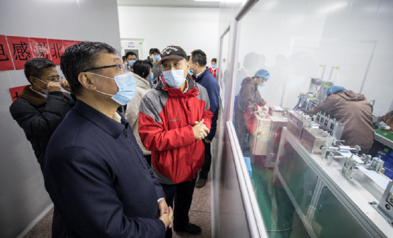 苗林一行首先来到昌平科技园区内的亚东生物制药有限公司,实地查看了该公司口罩生产线,对口罩原材料供应、生产技术、现场管理、生产供应保障等情况进行了解。苗林同志对亚东生物制药有限公司复工前员工的个人防护、体温检测和场所的消毒通风等工作给予充分肯定,并对该公司在疫情防控形势严峻之际,新增生产线,保证供应等举措给予赞扬。