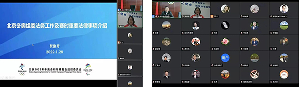 1月24日,北京冬奥组委法律事务部法务审核处处长贺淑芳通过线上方式为公益法律服务团及工作小组进行基础培训,从北京冬奥会和各国代表团整体情况、北京冬奥组委法务工作情况两个方面进行讲解。