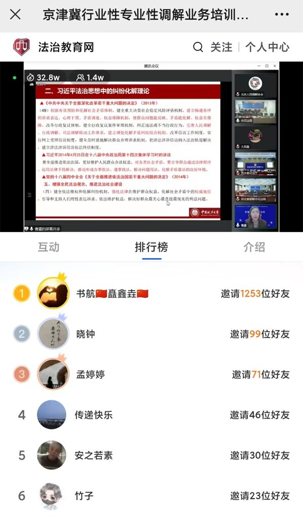 京津冀三地司法行政机关、相关行业主管部门、街道乡镇司法所、人民调解协会、行业性专业性调解组织的负责同志通过腾讯会议参会。京津冀三地线下各地分会场共组织7600余人通过腾讯会议室参会,法治教育网直播平台共吸引3.8万人次登录直播间参与培训和研讨活动,直播间热度达到90.9万,获点赞6.3万次。