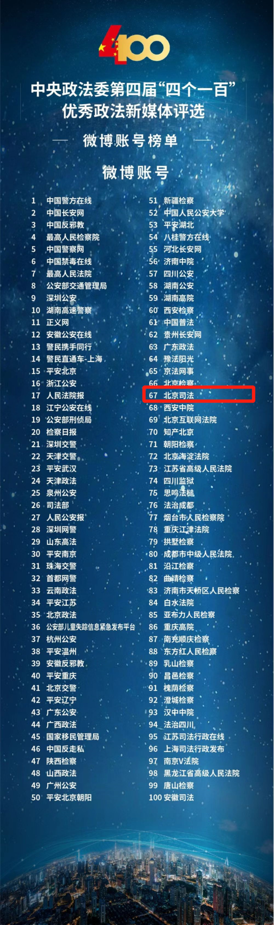 “北京司法”荣登中央政法委第四届“四个一百”优秀政法新媒体评选微博账号榜单