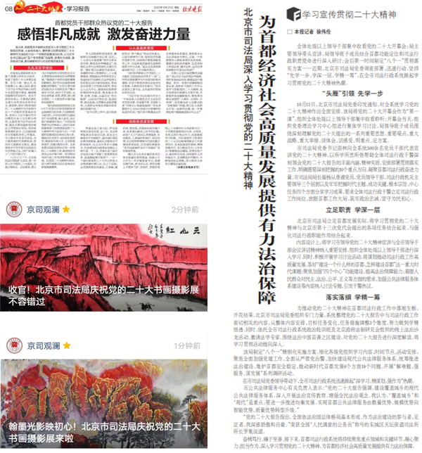 北京市司法局党委认真学习宣传贯彻党的二十大精神,紧贴实情实际,认真绘制全系统学习宣传贯彻的“施工图”“路线图”“效果图”,按图指挥、按图推进、按图追效,确保一步一个脚印推进新时代法治中国首善之区和更高水平平安北京建设。