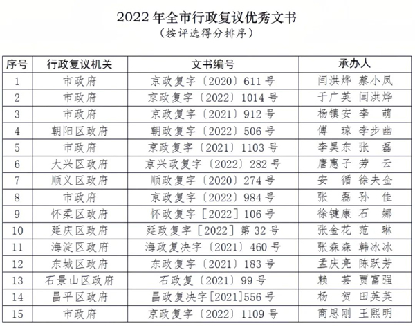 2022年12月,北京市司法局组织开展2022年度行政复议优秀文书评选工作,组织各区司法局、市政府各委、办、局法制工作机构报送符合《北京市行政复议优秀文书评选标准》的行政复议决定书,共收到27个单位报送的行政复议文书68篇。
