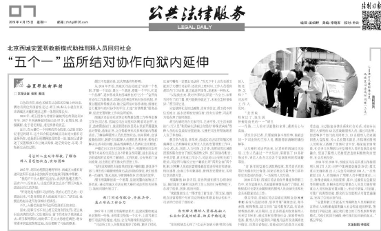 近日,《法制日报》以《北京西城安置帮教新模式助推刑释人员回归社会——“五个一”监所结对协作向狱内延伸 》为题,大篇幅报道本市安置帮教工作。