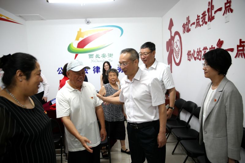 在西城区西长安街,张家明调研了西长安街法治文化长廊、公共法律服务室、普法公园建设情况。在公共法律服务室,正值调解一起社区矛盾纠纷,张家明同志认真旁听了矛盾纠纷的过程,询问群众有法律需求、找服务方便不方便,听取了社区主任关于人民调解、法律服务等情况的汇报。