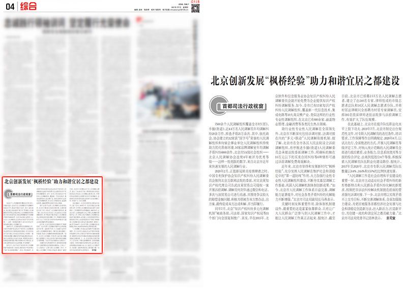 1月7日,《法治日报》以《北京创新发展“枫桥经验”助力和谐宜居之都建设》为题,报道了北京市坚持和发展新时代“枫桥经验”,充分发挥人民调解在维护社会和谐稳定中的“第一道防线”作用,大力加强行业性专业性人民调解组织建设,助力和谐宜居之都建设的工作成果。