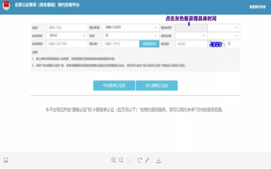 注册后,点击图一中“民生类公证预约咨询平台”图,进入预约页面。点击“获取验证码”,并输入收到的短信验证码。