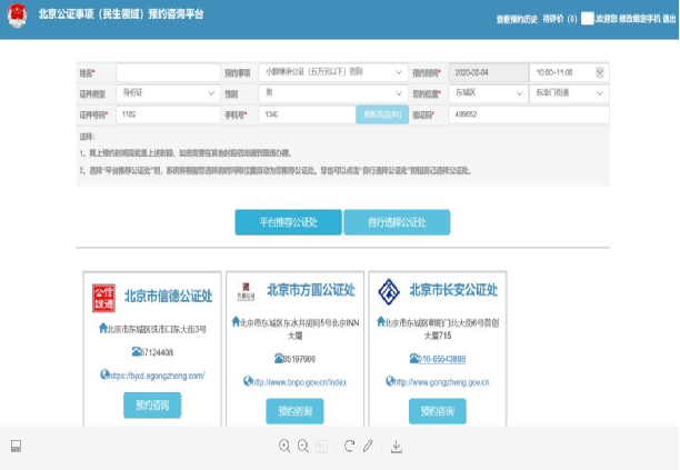 点击“平台推荐公证处”或“自行选择公证处”(点击“平台推荐公证处”时,系统会根据群众的位置推荐附近的3家公证处;如果群众有熟悉的公证处,也可以点击“自行选择公证处”,从北京市的25家公证处中直接选择),页面下方即会显示出待选公证处名单。