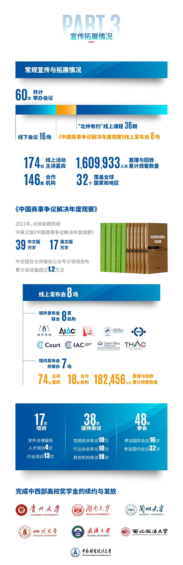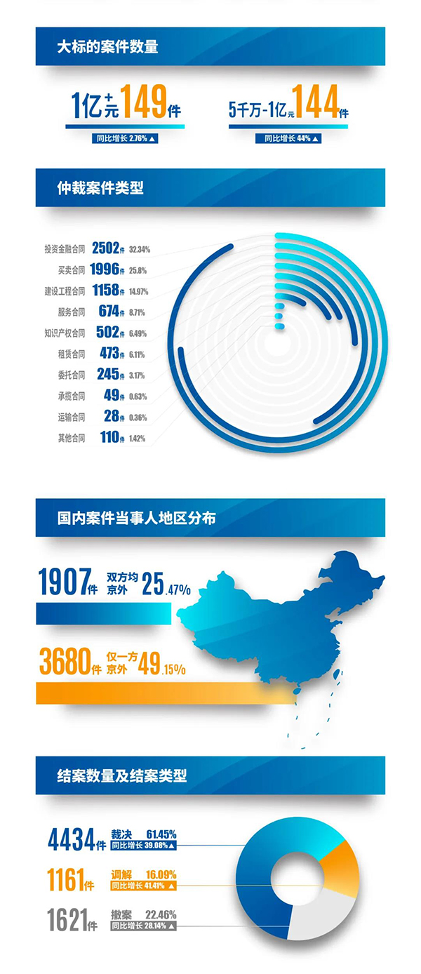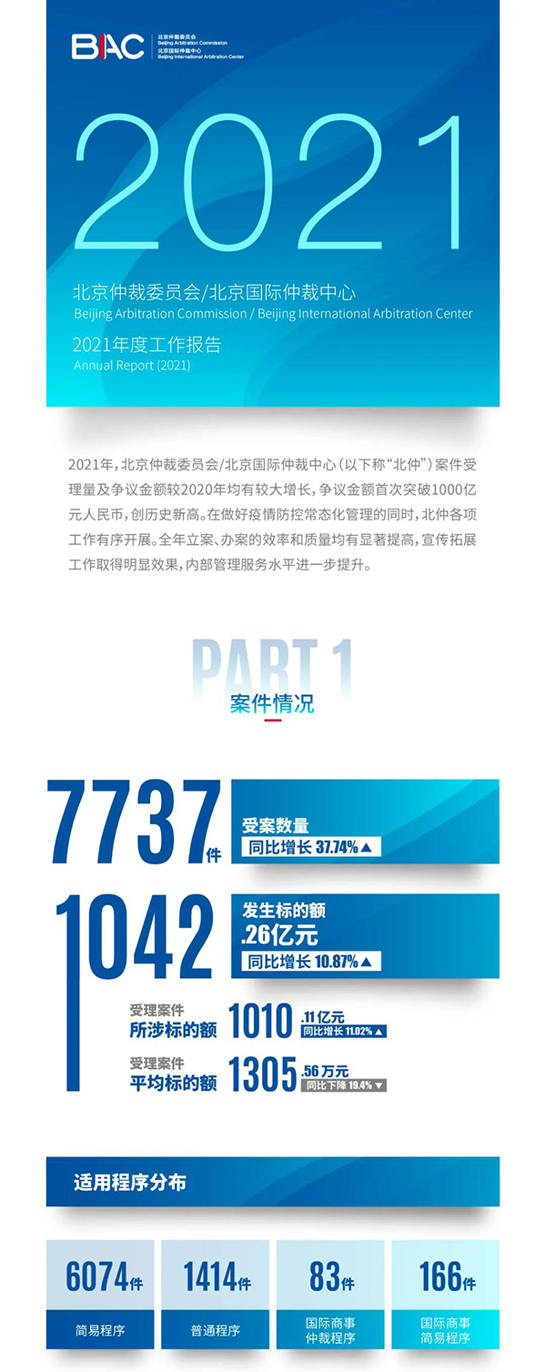 北京仲裁委员会/北京国际仲裁中心2021年度报告新鲜出炉,受案数量7737件,国际商事仲裁案件当事人涉及25个国家和地区,举办首届中国国际服务贸易法律论坛,开展“北仲有约”系列网络课程36期。