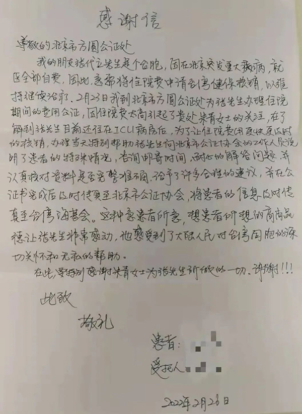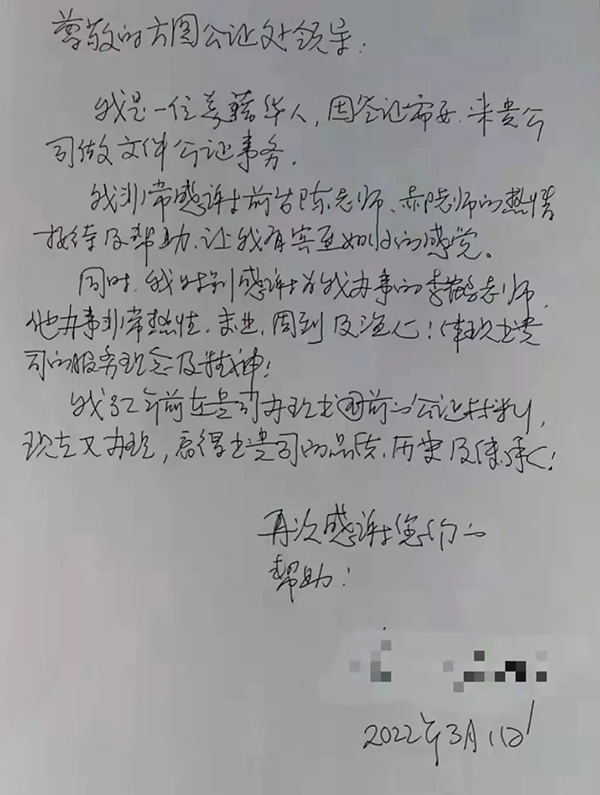 这位美籍华人在手写的感谢信中,深情地写下:“32年前在贵司办理出国前的公证材料,现在又办理,看得出贵司的品质、历史及传承!再次感谢你们的帮助!”
