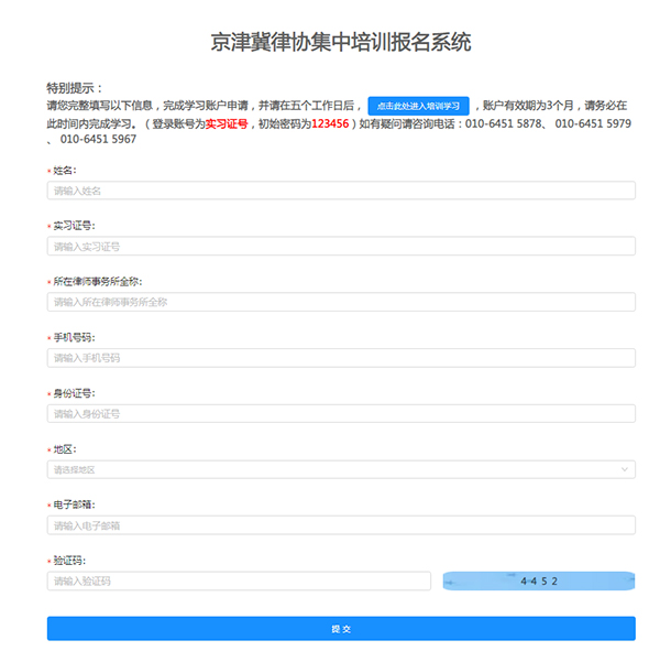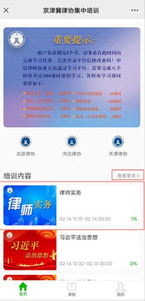 完成学习账户申请后,请在5个工作日后,登陆京津冀律协集中培训平台进行学习,账户有效期3个月,请务必在此时间内完成学习。