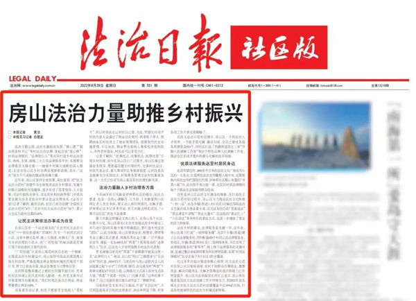 经过多年的稳步推进和精心培育,民主法治示范村在房山全区接续涌现,农村干部群众办事依法、遇事找法、解决问题用法、化解矛盾靠法的意识和能力已有明显提升。房山区司法局副局长肖红云表示,房山将在推进基层民主法治创建工作中持续发力,到2022年底实现北京市民主法治示范村创建覆盖全区30%的目标,打造具有地域特色的法治乡村建设新样板。