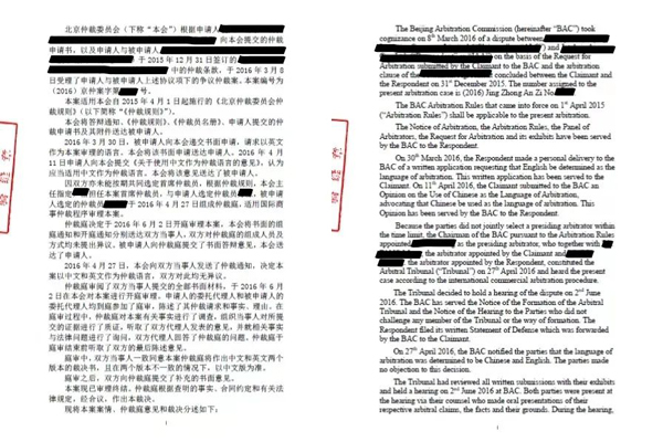 北仲作出的中英双语裁决摘选