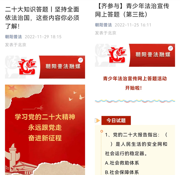 朝阳区司法局把学习宣传贯彻党的二十大精神与普法宣传、公共法律服务等工作结合起来,融入贯彻落实全国“八五”普法规划关于“加强青少年法治教育”的部署,通过“朝阳普法”微信公众号开展“二十大知识问答”活动,推动党的二十大精神从机关到基层全覆盖,让党员群众争做党的二十大精神学习“答”人。