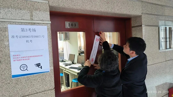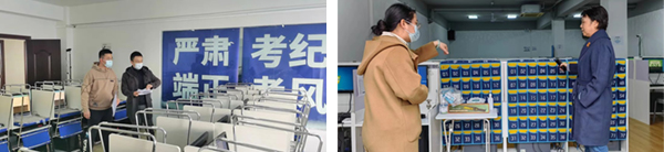 考前两天,各考点工作人员紧锣密鼓地布置考场,对系统和电脑等进行最后测试和检查,确保机位、网络、服务等软硬件符合考试标准,直至圆满完成各考场封场工作,确保万无一失。