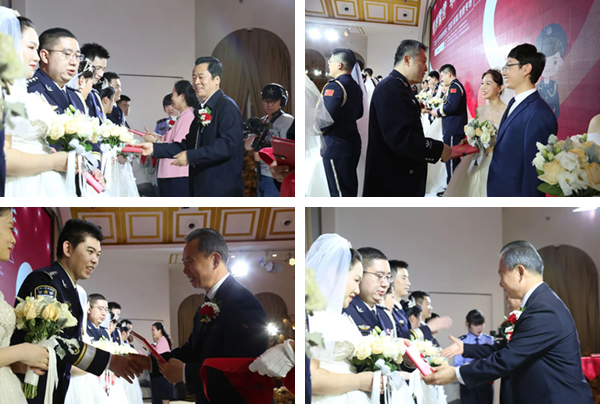 市政法卫生文化工会主席张树坡,市监狱(戒毒)管理局党组副书记、政委禹冰,市委社会工委、市民政局二级巡视员牛国政,市司法局二级巡视员王桂芳等4名嘉宾为新人们送上证书和祝福。