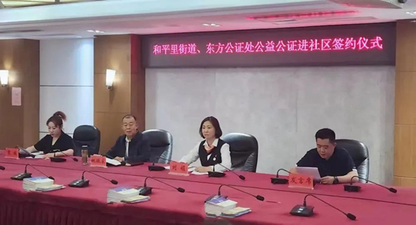 近日,北京市东方公证处与东城区和平里街道举行“公益公证进社区”签约仪式,实现一名公证员对接服务一个社区,提供定点、预约和远程服务,建立公证服务社区长效机制,开启“公益公证进社区“服务模式,真正做到群众有需求,公证有回应。双方正式签署《社区公益公证法律服务合作协议》,现场公布20名公证员联系方式,公证员代表与社区代表完成对接,搭建起“一对一”公证顾问服务关系。