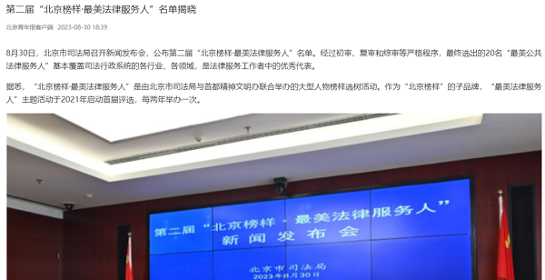 北京日报客户端发表文章《最新“北京榜样·最美法律服务人”揭晓!附全名单——》,介绍本届“最美法律服务人”选拔情况,并附上本届20名“最美法律服务人”名单。