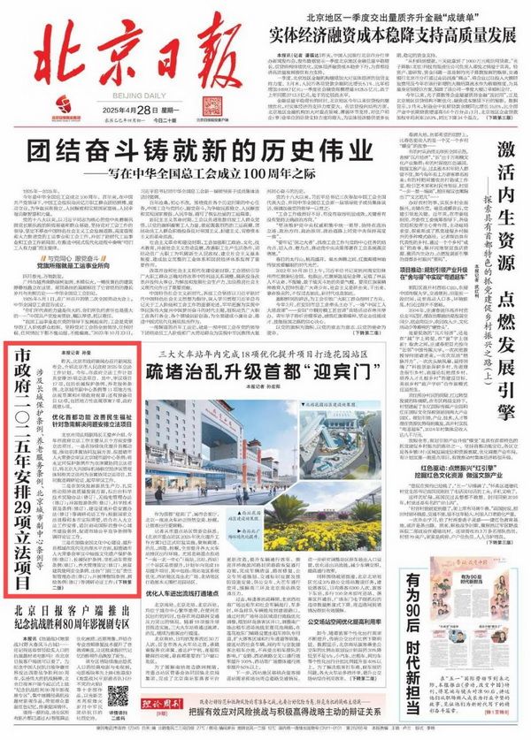 北京日报头版登载了题为《市政府二〇二五年安排29项立法项目 涉及长城保护条例、养老服务条例、北京城市副中心条例等》的文章,分“优化首都功能 改善民生福祉 针对急需解决问题安排立法项目”“立法破解养老难点堵点 养老服务条例启动起草”“群众关心问题将进行制度设计 城市副中心立法是年度重点任务”三部分进行解读。