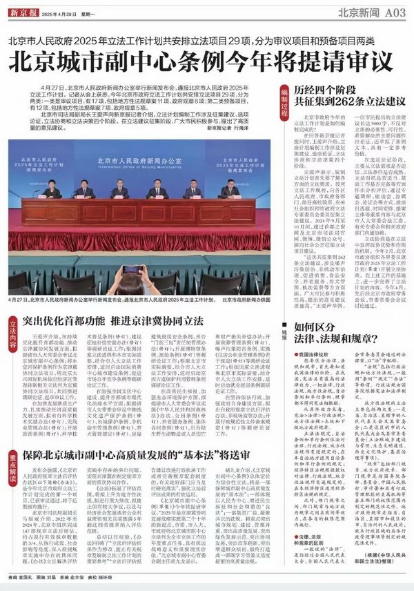 新京报整版刊载了《北京市人民政府2025年立法工作计划共安排立法项目29项,分为审议项目和预备项目两类 北京城市副中心条例今年将提起审议》,聚焦“立法内容 突出优化首都功能 推进京津冀协同立法”“重点解读  保障北京城市副中心高质量发展的‘基本法’将送审”“编制过程 历经四个阶段共征集到262条立法建议”“如何区分法律、法规和规章”等立法内容,进行报道。
