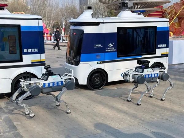 在北京经济技术开发区,无人巡逻宣防车与机器犬参与巡逻宣防