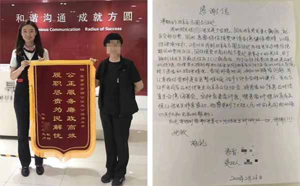 北京市方圆公证处团支部书记朱青接待群众时,遇到了一位焦急的当事人,经仔细询问,原来台胞张先生在北京突发重大疾病,急需将高昂的住院费申请台湾相关部门进行核销,以维持后续的治疗。为此,委托乔女士到方圆公证处办理住院期间的费用公证。办理过程中,朱青耐心地向代理人解释办证流程,仔细核对提交资料,并给出合理化建议。在感谢信中,乔女士代表张先生写道:“这种急患者所急、想患者所想的高尚品德让张先生非常感动,他感受到了大陆人民对台湾同胞的深切关怀和无私帮助。