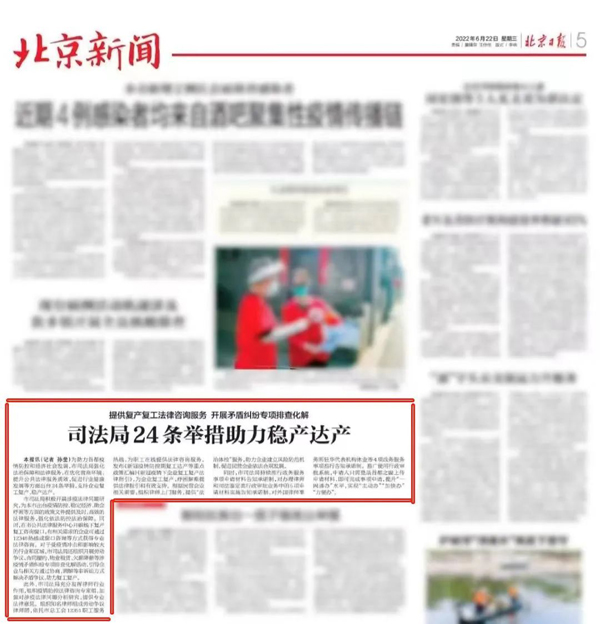 北京日报以《司法局24条举措助力稳产达产》为题,报道市司法局为支持企业复工复产、稳产达产出台的24条举措