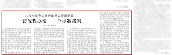 2022年7月7日,《人民日报》刊发《北京市整合优化行政复议资源配置 一套流程办案 一个标准裁判》一文,报道北京市行政复议体制改革情况