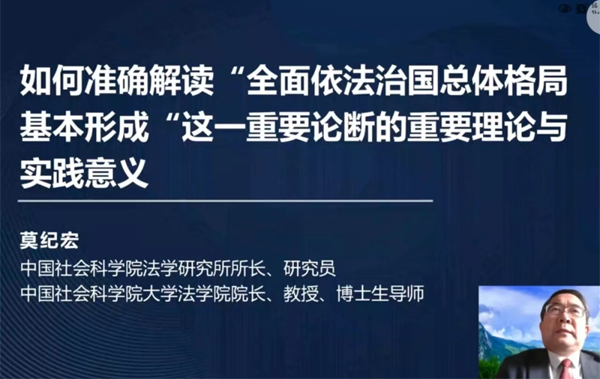 当天上午,中国社会科学院大学法学院院长、中国社会科学院法学研究所所长莫纪宏,围绕如何准确解读“全面依法治国总体格局基本形成”的重要理论和实践意义,从党的二十大报告作出的重要论断、全面依法治国总体格局基本形成的过程、内涵、特征及重要意义五个方面作了专题讲座。