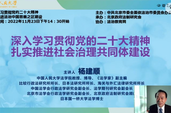 下午,中国法学会行政法学研究会副会长、中国人民大学法学院教授杨建顺,就“深入学习贯彻党的二十大精神 扎实推进社会治理共同体建设”,从深入学习贯彻党的二十大精神的方法内容、社会治理的概念和主体、基层治理的基本范畴、上级机关和职能定位、推进基层法治建设的定位、依法推进社会治理共同体建设及合法规范运营机制的追求七个方面作了专题讲座。