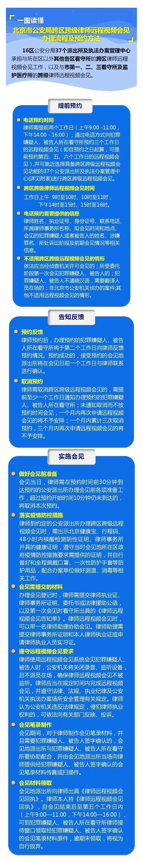 律师远程视频会见再升级。在常态化疫情防控下,为保障看守所在押犯罪嫌疑人、被告人和律师会见,依法进行提升律师执业便利,确保刑事诉讼活动顺利开展。自2022年6月1日起,北京市公安局将在全市范围推行跨区域、跨层级律师远程视频会见工作,实现16区全覆盖。
